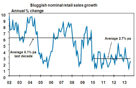 When looking for growth in non-mining investments to fill the gap left by the mining investment boom, retail sales are critically important accounting for nearly 20% of economic activity in Australia. As is well known Australian retailers have had it tough for nearly four years now. Nominal retail sales growth has averaged 2 to 3% since 2010, which is less than half the 6% annual pace seen last decade.