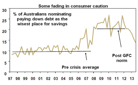 First, while consumer caution clearly remains it appears to be fading a bit. The household savings rate is no longer rising, having stabilised at around 10 to 11%, but more interestingly the proportion of Australian's nominating paying down debt as the "wisest place for savings" has fallen to its lowest since 2007.
