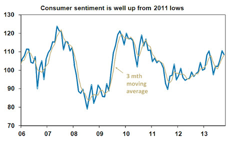 Sixth, the surge in the price of electricity looks to be slowing after 5 or so years of 10 to 15% gains. Over the year to the September quarter it had slowed to a 6.1% gain and it could even go backwards by 5% or so in 2014-15 if the carbon tax/ETS is abolished. This could provide a huge psychological boost to perceptions of household finances.